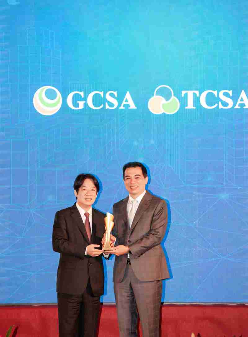 达全方位永续表现获全球永续奖及台湾永续奖肯定,,,,由副总统赖清德颁奖 (左),,,糖果派对总经理柯富仁 (右) 代表领奖