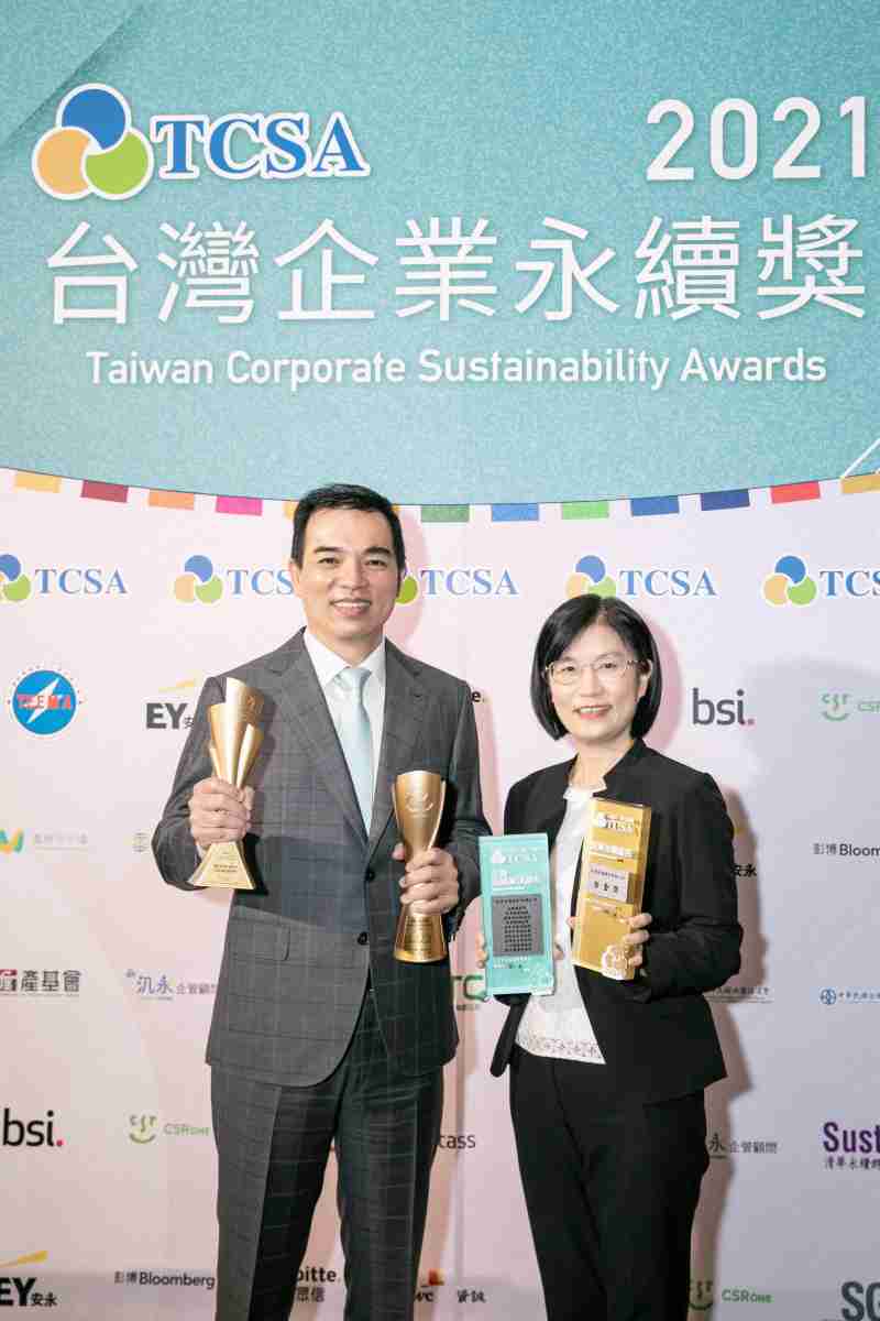 达在台湾永续奖所评比环境、、、、社会、、治理等各面向的永续绩效均获高度肯定 (左:糖果派对光电总经理暨营运长柯富仁,,右:糖果派对光电永续长古秀华)
